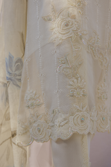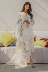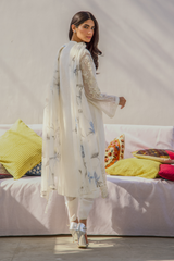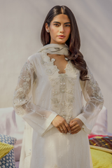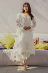 An all-white ensemble for Eid is a MehreenMahnaz classic, this time with a beautiful hand painted dupatta with accents of violet! Ersa is an intricately hand worked ensemble with neck and sleeve detailing, paired with a tulip silk shalwar.