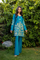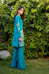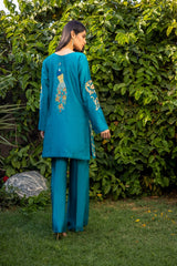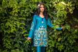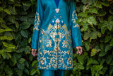 Mala is a tea khadi silk short kameez and bell bottom with resham embroidery featuring signature MM peacocks on the front and back. A must have outfit to be dressed up or down for any intimate occasion.