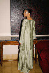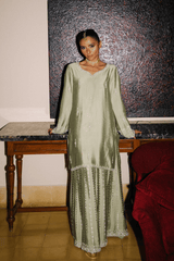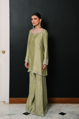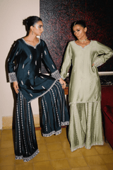 This sage green matching silk set is adorned with intricate embroidery, zardozi handwork as well as mirror, stone and pearl detailing.The perfectly versatile two-piece to add to your wedding fits this season.