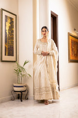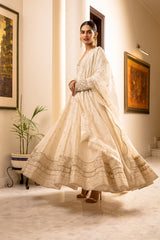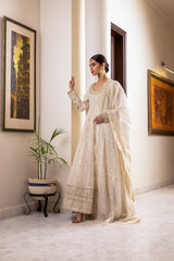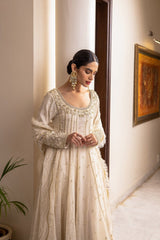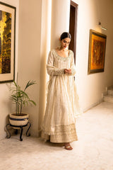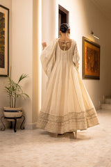 Anarkali, the name inspired by the silhouette is a regal khadi net peshwas, fully hand worked with zardozi, kamdaani and pearl accents on the front and back. The outfit comes with a statement back with a handworked bird motif and a khadi net dupatta with pearl detailing and a frayed hem, along with a khadi silk straight pant.