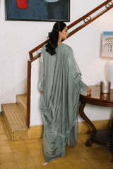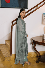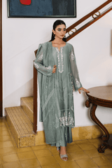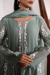 The sage green set is adorned with delicate ivory resham embroidery on the kameez and izaar. The ensemble is completed with a beautiful dupatta with lace and embroidered detailing.