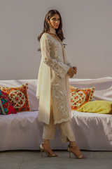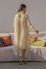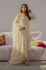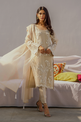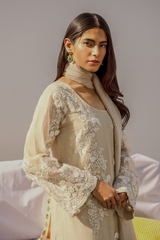 MM adores beige evening wear, and Suri in all its elegance stands out as a favorite this season. What sets this ensemble apart is the intricate embroidery and handwork embellishing the entire kameez, including delicate detailing on the back. Paired with a straight trouser and a dupatta featuring tassels on its edges.