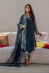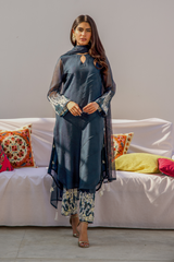 Zaha, in rich crystal teal, features iconic MM embroidery adorning its sleeves and trousers, complemented by a hand worked dupatta. The intricate embroidery on the trousers add a touch of uniqueness to this ensemble.