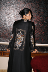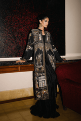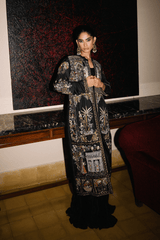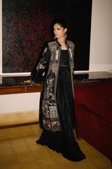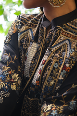 A Kamli favourite, this black raw silk coat adorned with resham and zardozi embroidery and hand-worked embellishments. Paired with a choli with beaded accents and a crushed silk lehenga. The perfect easy, eye-catching and glamorous fit for this wedding season