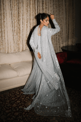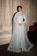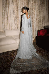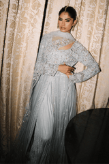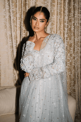 This ice blue kalidaar is adorned with zardozi handwork, creating a regal effect that sparkles through. Paired with a crushed silk lehenga and a dupatta that exudes glamour, featuring delicate handwork and tassel detailing.