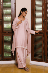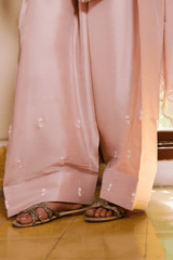 This powder pink raw silk set features intricate pearl and beaded hand work on the kameez and farshi shalwar. Paired with an embroidered delicate chiffon dupatta, offering a soft and luxurious feel. Perfect for all festive occasions this season.