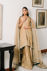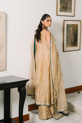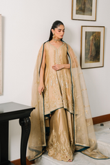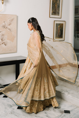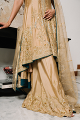 A silk peplum top adorned with intricately crafted zardozi handwork on the front and back, paired with a heavily worked gold dhaka pyjama. Completing this ensemble is a zuri net dupatta with accents of gota hand embellishments. A colour pop of emerald green silk makes Topaz take centre stage this festive season.