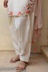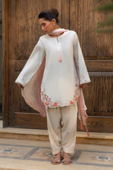 Off-white Irish cotton kameez and shalwar with embroidered resham motifs in hues of pink, paired with a shaded chiffon dupatta with embroidered accents.