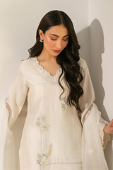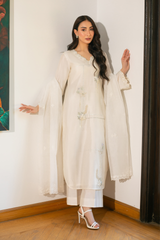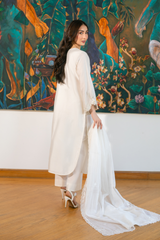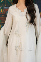 Soft ivory silk detailed with floral lace, pearl and sequin handwork, and delicate embroidery throughout the shirt. A khadi net dupatta with scalloped embroidered edges completes the look with understated elegance.