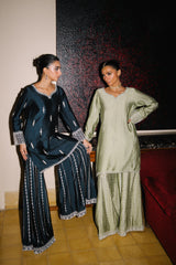 This navy-blue matching khadi silk set is adorned with intricate embroidery, zardozi handwork as well as mirror and stone detailing. Pari is the perfectly versatile two-piece to add to your wedding fits this season