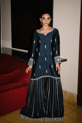 This sage green matching khadi silk set is adorned with intricate embroidery, zardozi handwork as well as mirror and stone detailing. Pari is the perfectly versatile two-piece to add to your wedding fits this season.