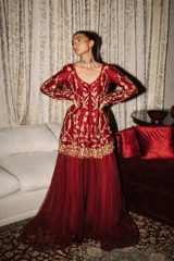 Discover Saha, a perfect blend of opulence and modern elegance. This luxurious burgundy raw silk peplum top features intricate zardozi and colorful resham embroidery, paired with a stunning flared organza sharara. Ideal for making a statement at special occasions.