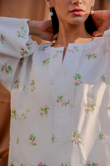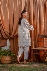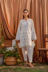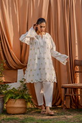 In cool and airy lawn cotton, Deena adorns intricate floral embroidered motifs and scalloped edges. The outfit is paired with a skinny shalwar and comes with an separate inner lining to help with all your summer whites!