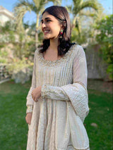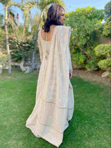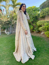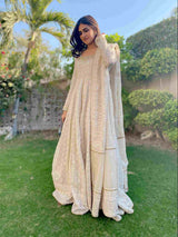 Mahnoor is a bespoke off-white embroidered khadi net peshwas, consisting of delicate resham, mirror, pearl and sequins hand work. This ensemble is a show-stopper for all seasons, combining elegance with intricate detailing and gota accents, bound to make you fall in love.