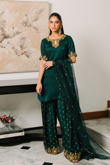 An exquisite midnight blue pure raw silk shirt hand embroidered with gold zardozi detailing. This luxurious piece is paired with raw silk shalwar with matching zardozi embellishment and organza dupatta with sequence detailed work.